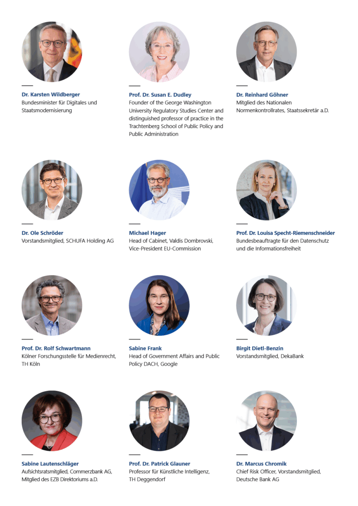 11:00 Uhr | Podiumsdiskussion Ist Deregulierung ernst gemeint? Prof. Dr. Susan E. Dudley, Founder of the George Washington University Regulatory Studies Center and distinguished professor of practice in the Trachtenberg School of Public Policy and Public Administration Prof. Dr. Patrick Glauner, Professor für Künstliche Intelligenz, TH Deggendorf Dr. Reinhard Göhner, Mitglied des Nationalen Normenkontrollrates, Staatssekretär a.D. Michael Hager, Head of Cabinet, Valdis Dombrovski, Vice-President EU-Commission Dr. Karsten Wildberger, Bundesminister für Digitales und Staatsmodernisierung Moderation: Benjamin Desalm, BCG |